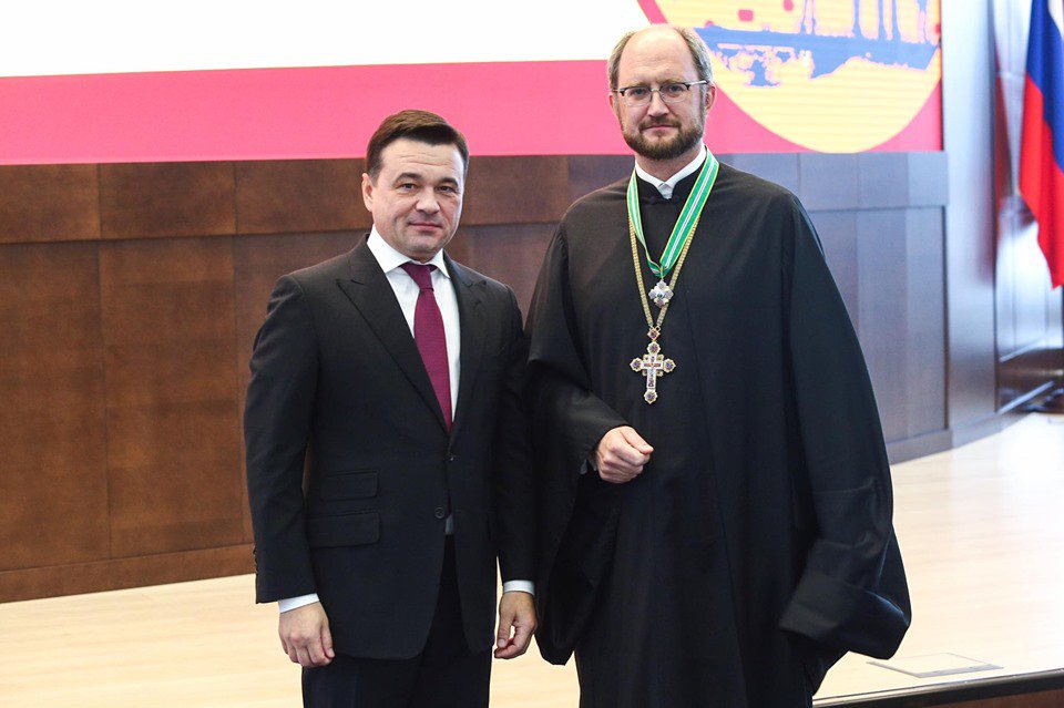 Губернатор Московской области Андрей Воробьев вручил основателю и руководителю Санкт-Петербургского Детского хосписа, председателю комиссии по вопросам благотворительности, гражданскому просвещению и социальной ответственности Общественной палаты РФ, протоиерею Александр Ткаченко знак преподобного Сергия Радонежского за открытие детского хосписа в Домодедове.