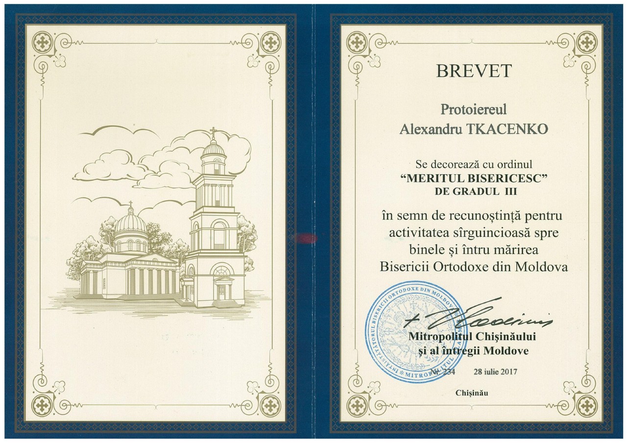 Митрополит Кишиневский и всея Молдовы Владимир (Николай Кантарян) сегодня, 28 июля, наградил протоиерея Александра Ткаченко Орденом за заслуги перед Русской Православной Церковью республики Молдова. Митрополит Владимир отметил, что отец Александр удостоен Ордена в знак признательности за его активное участие в церковных делах. «Для меня это неожиданность и большая честь получить такую высокую награду. Я искренне тронут. Благодарю Ваше Высокопреосвящество за признание и доверие», - ответил протоиерей Александр Ткаченко.