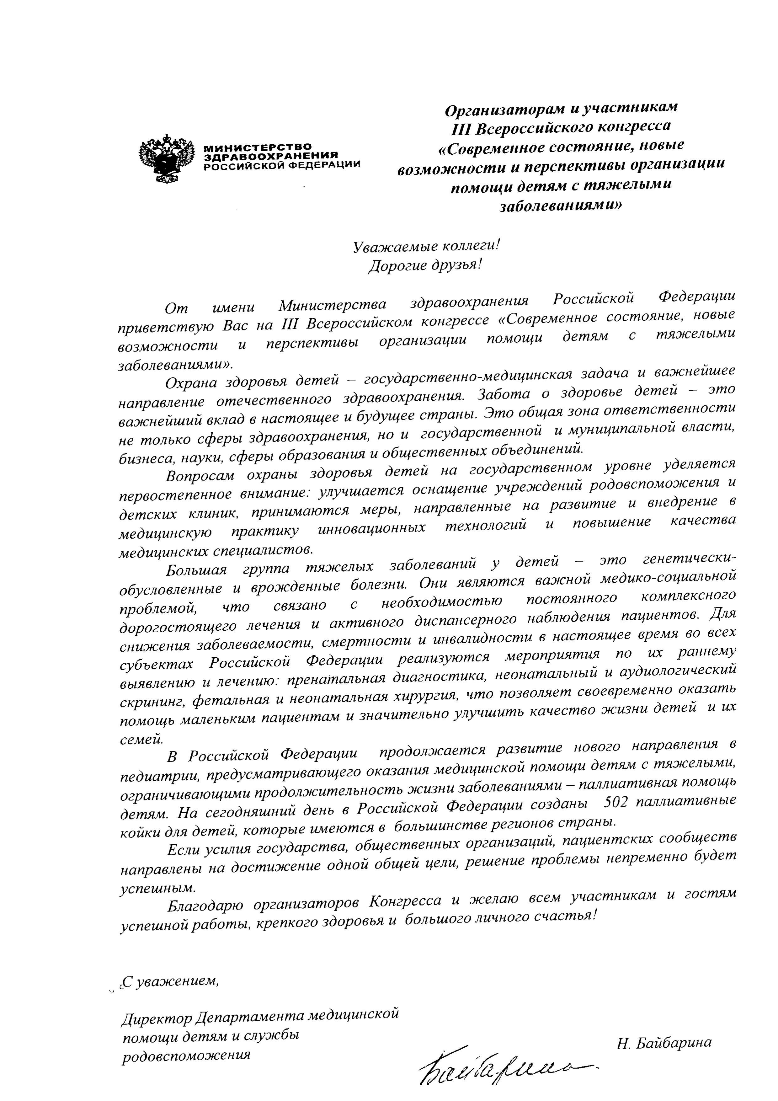 Обращение к организаторам и участникам III Всероссийского конгресса "Современное состояние, новые возможности и перспективы организации помощи детям с тяжелыми заболеваниями" от директора Департамента медицинской помощи детям и службы родовспоможения Е. Н. Байбариной